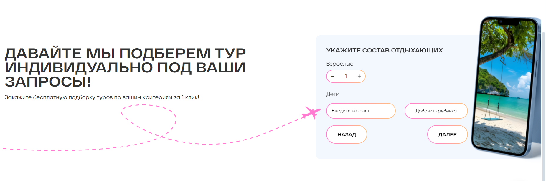 4.Текст "Давайте мы подберем..." заменяем на "Закажите индивидуальное предложение тура с перелетом на бизнес джете Black Jet за 1 клик!", подзаголовок "Закажите бесплатную подборку...."- убираем